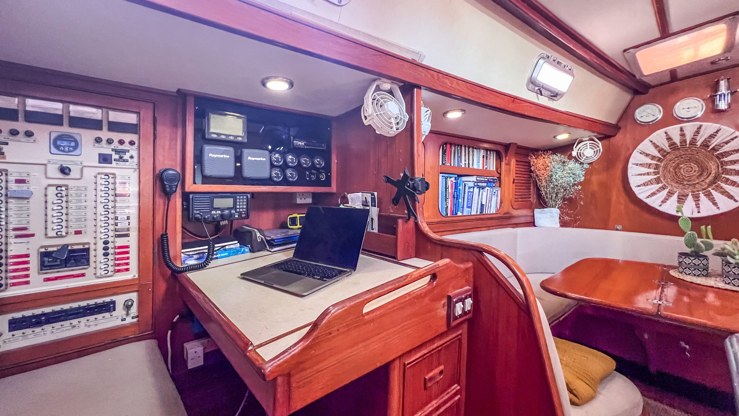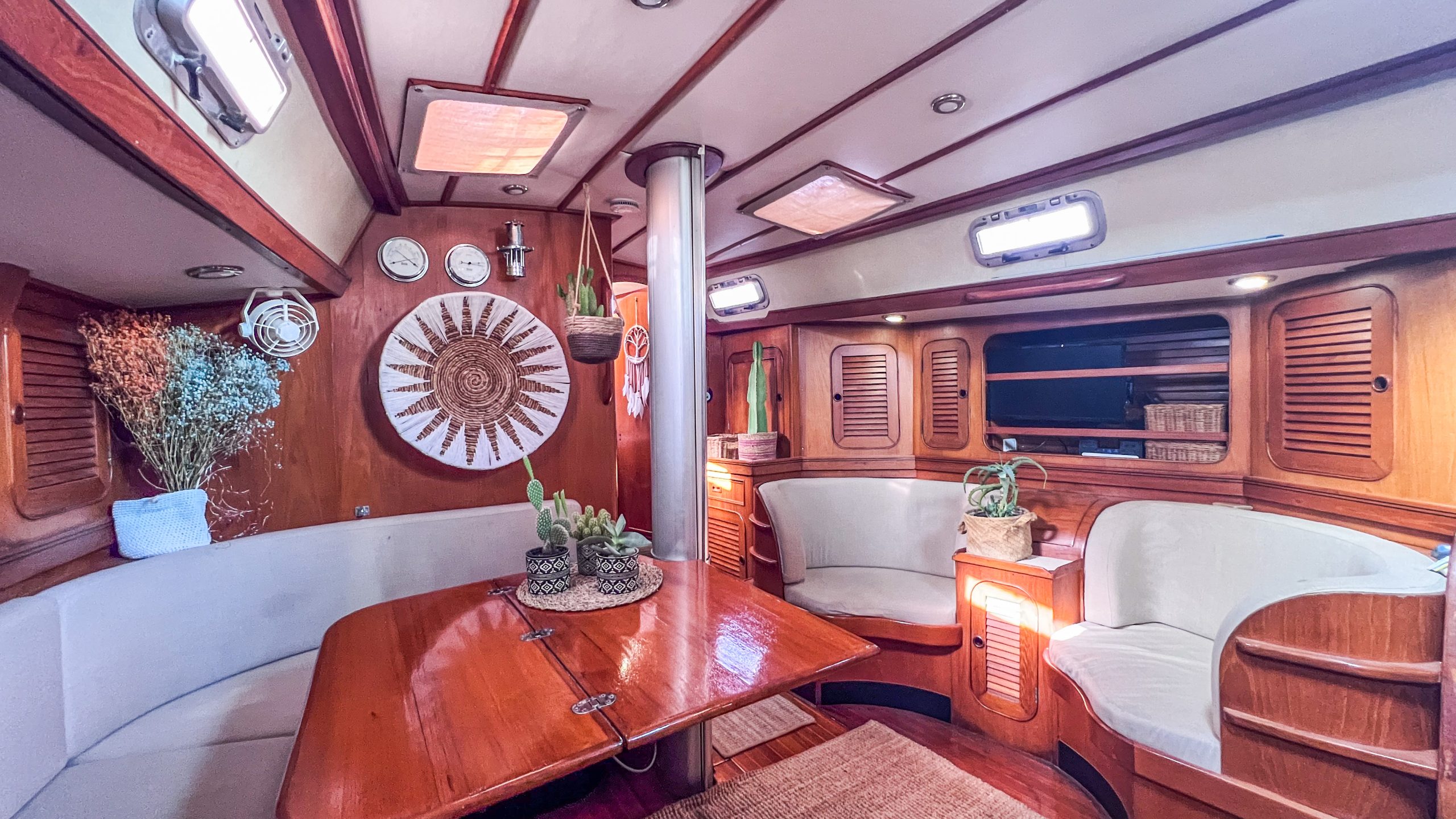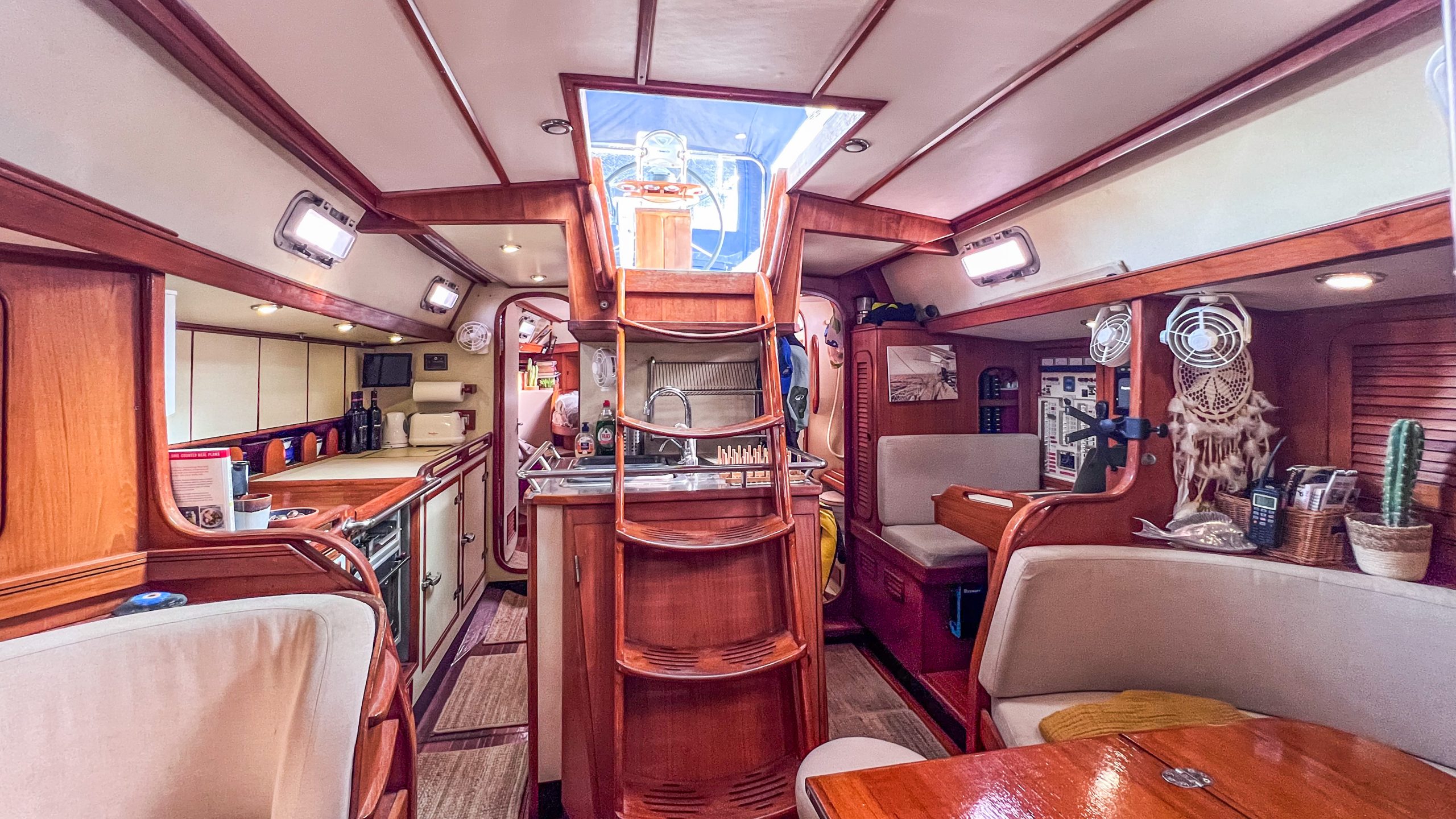 Biminis, large spray hood, full cockpit cover enclosure, cockpit cushions, varnished cockpit folding table with drinks holder.