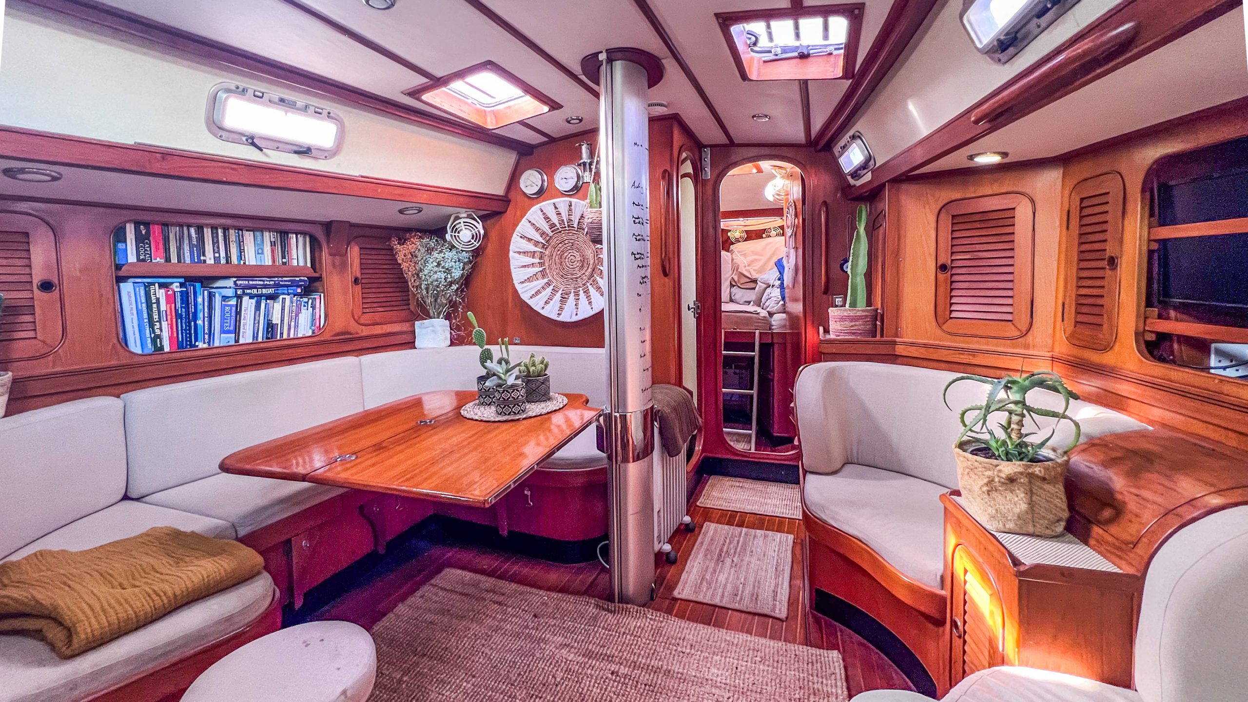 Interior joinery of varnished teak, cabin sole of teak and ash.